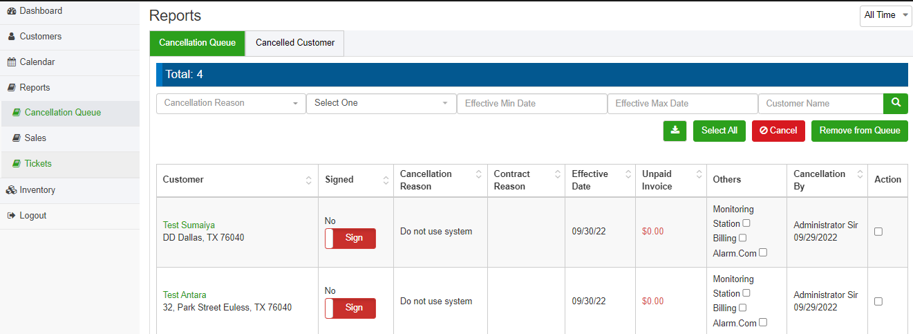 - You can remove any customer from the cancellation queue by clicking on the Remove from Queue button.